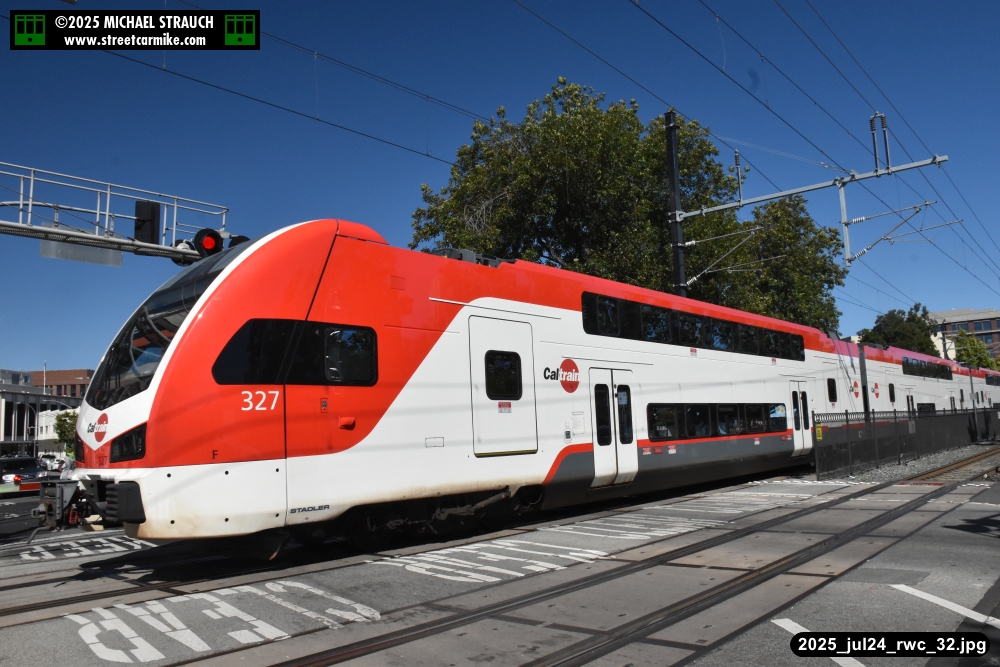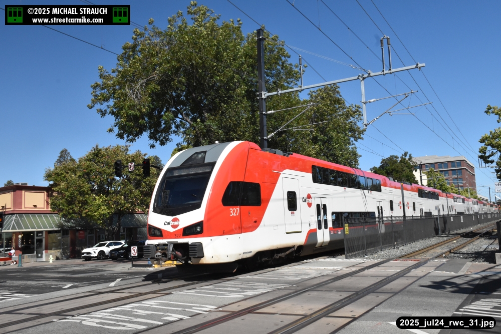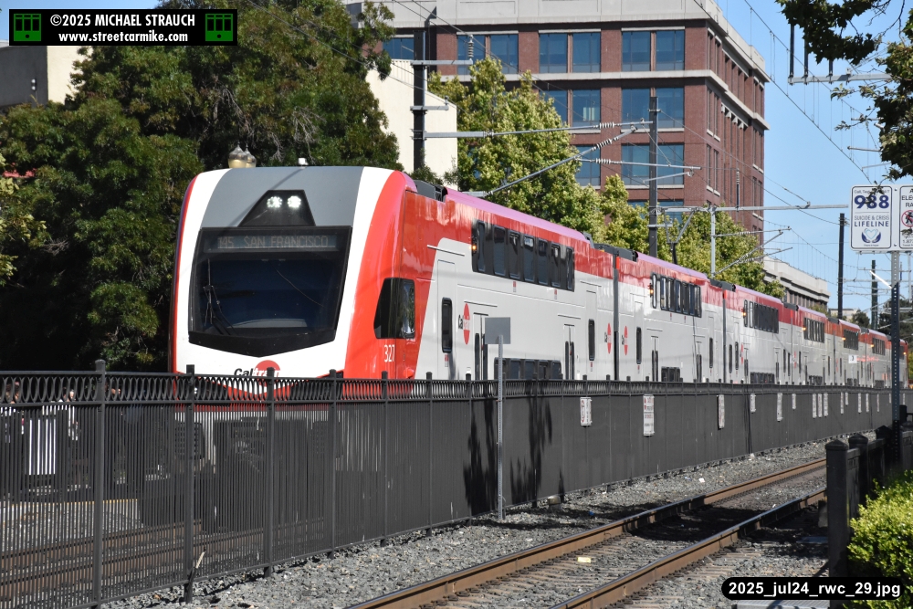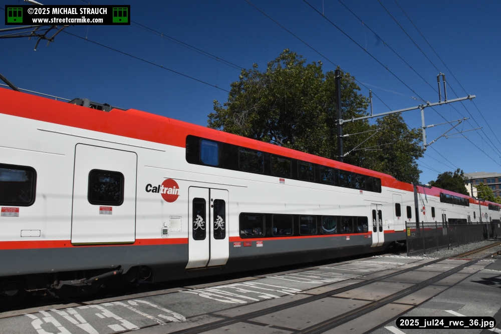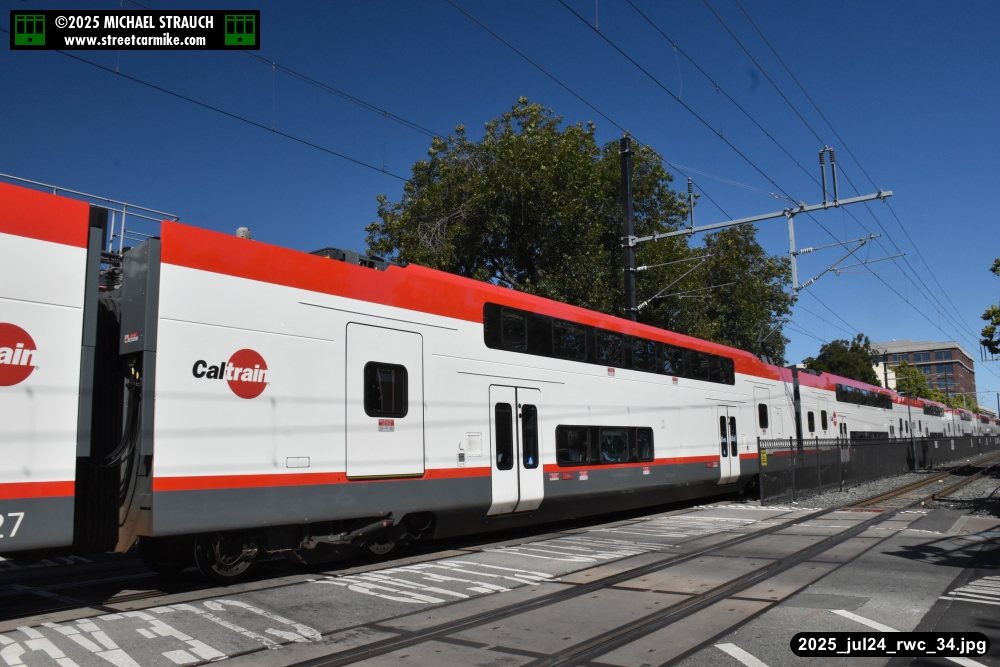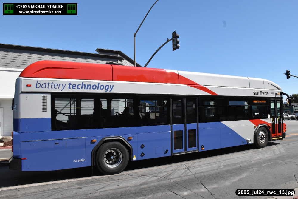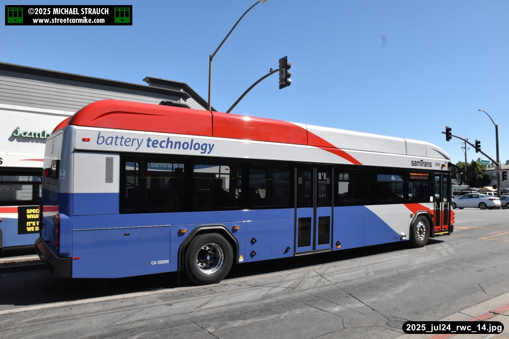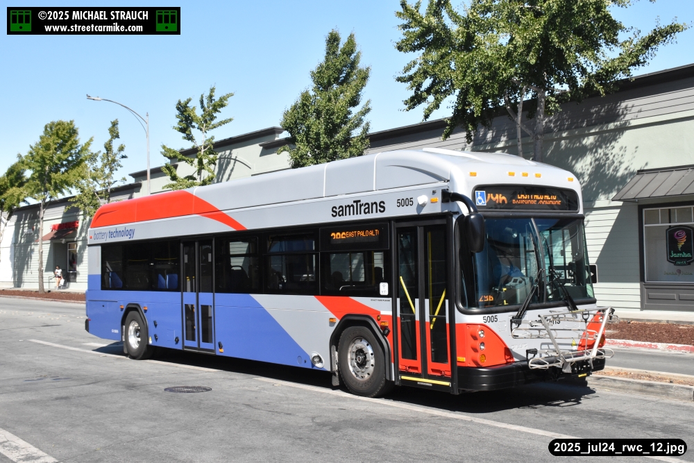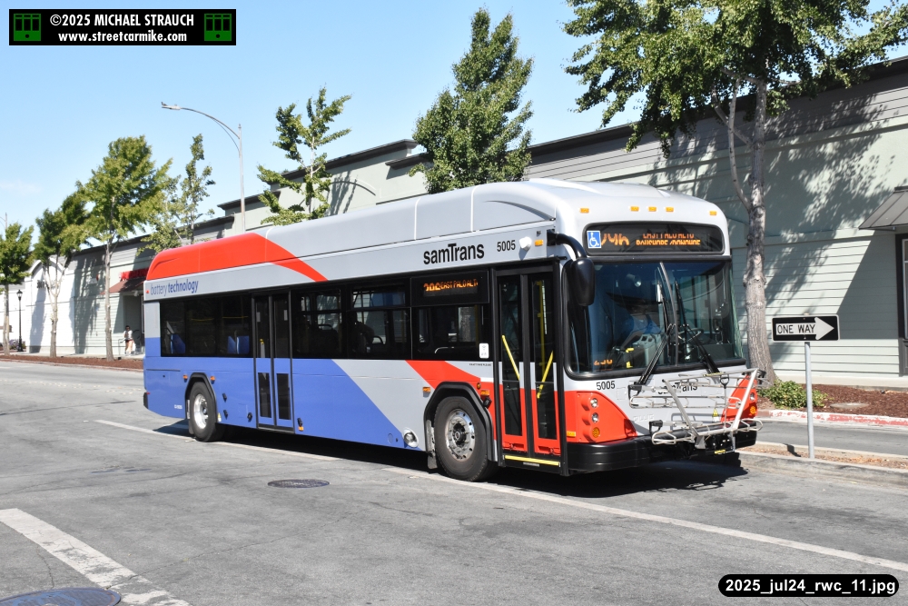 Gillig electric 5005 leaving on the 296 to East Palo Alto. Two Caltrain consists are included.