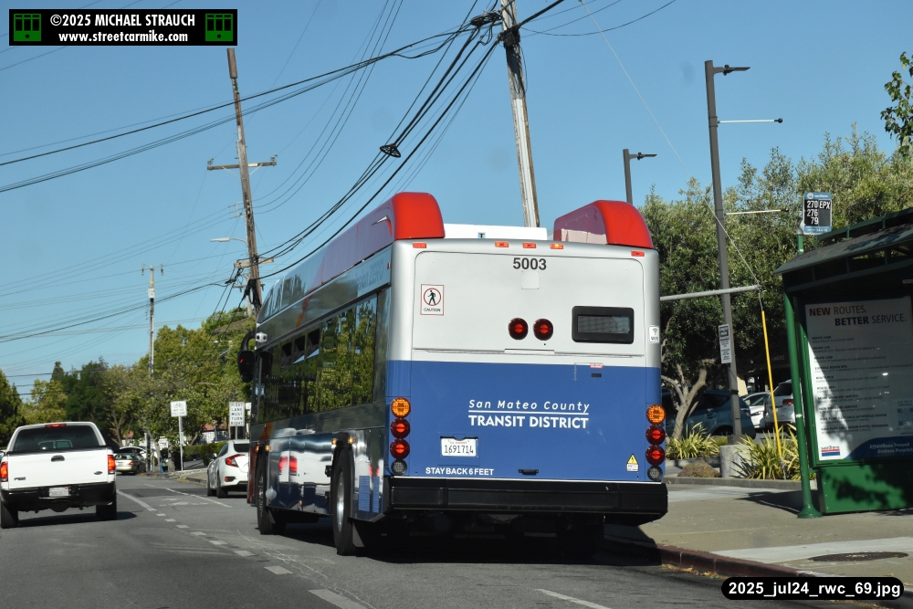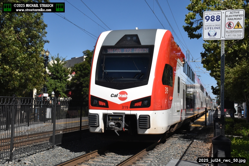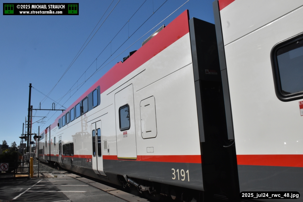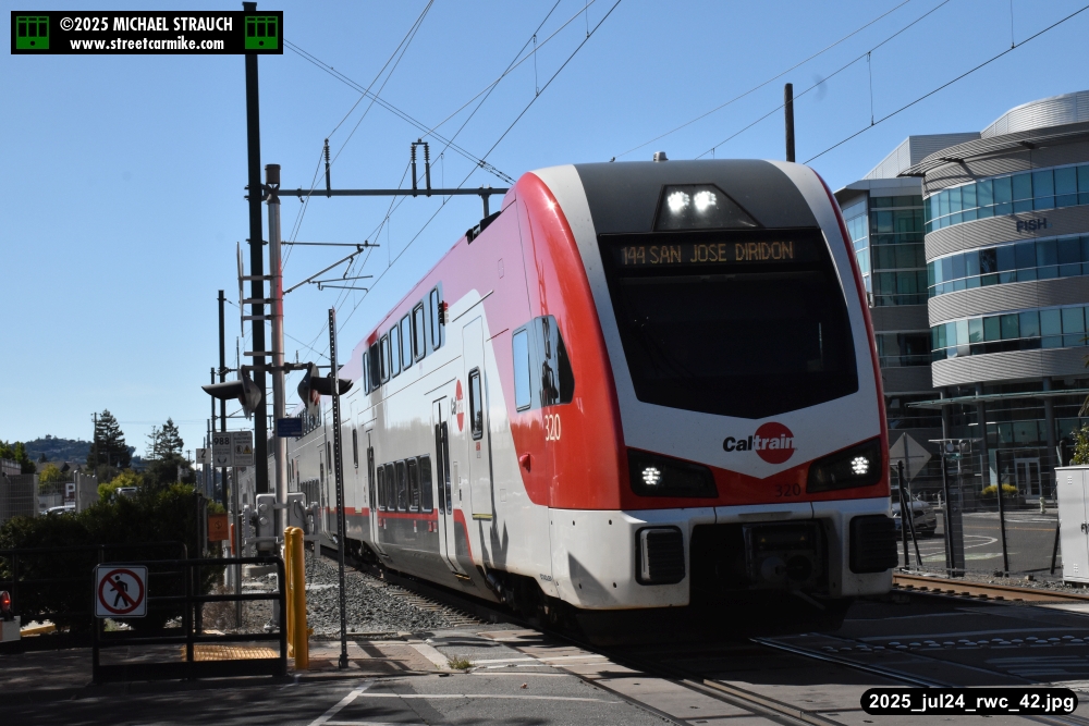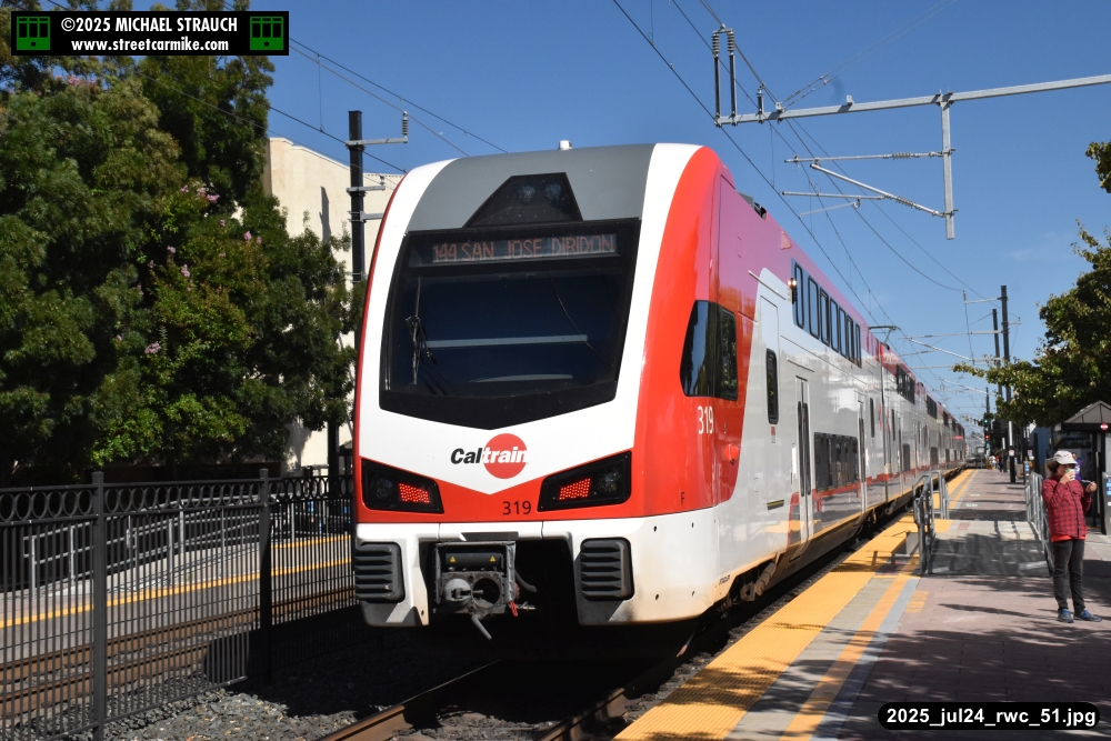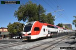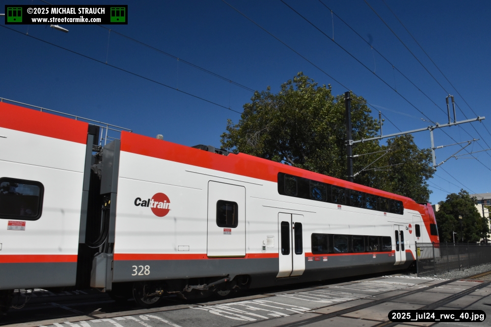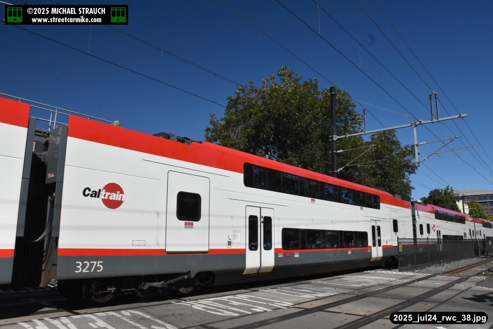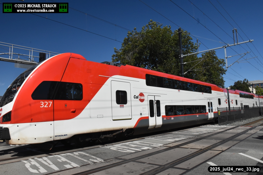 Gillig electric 5005 leaving on the 296 to East Palo Alto. Two Caltrain consists are included.
