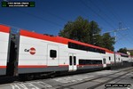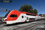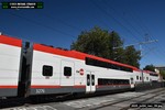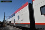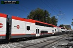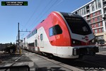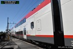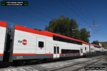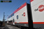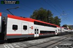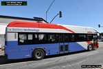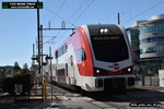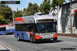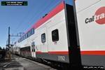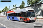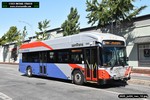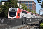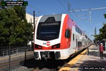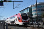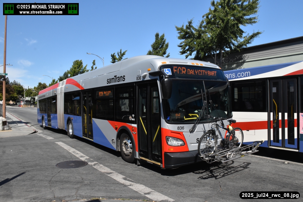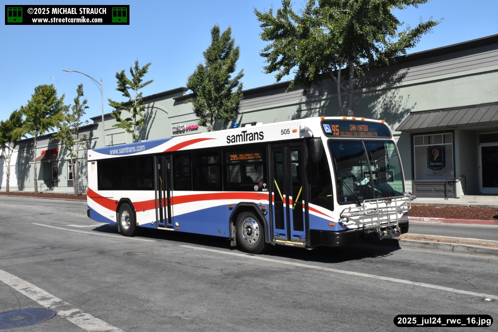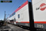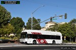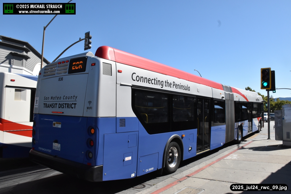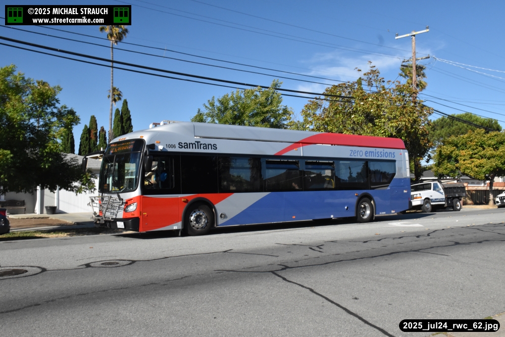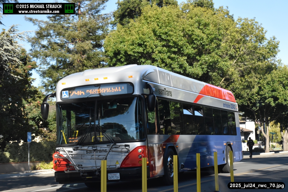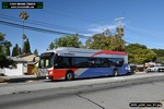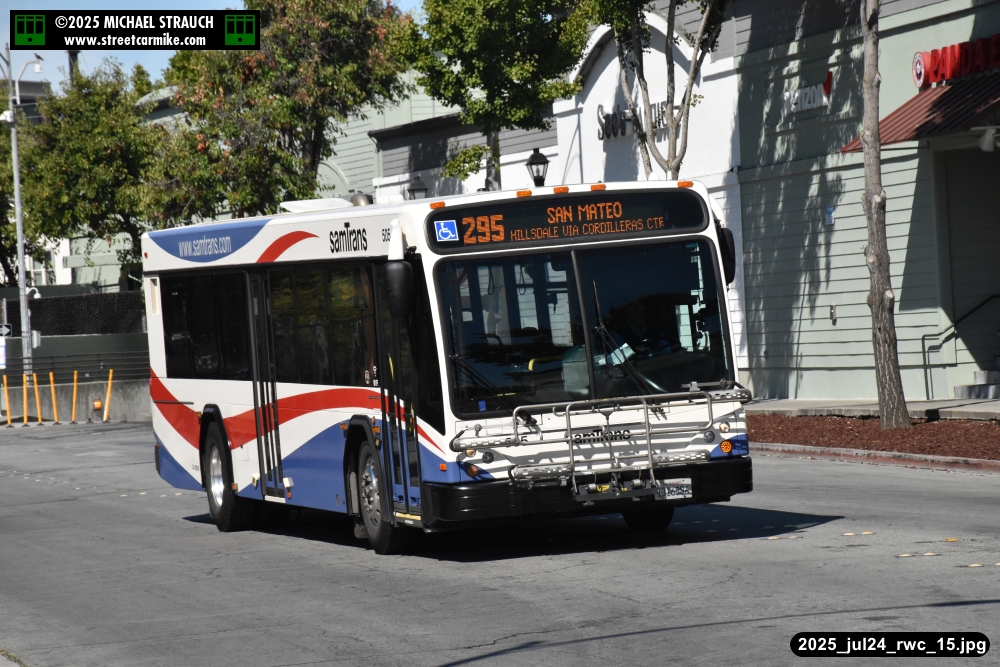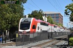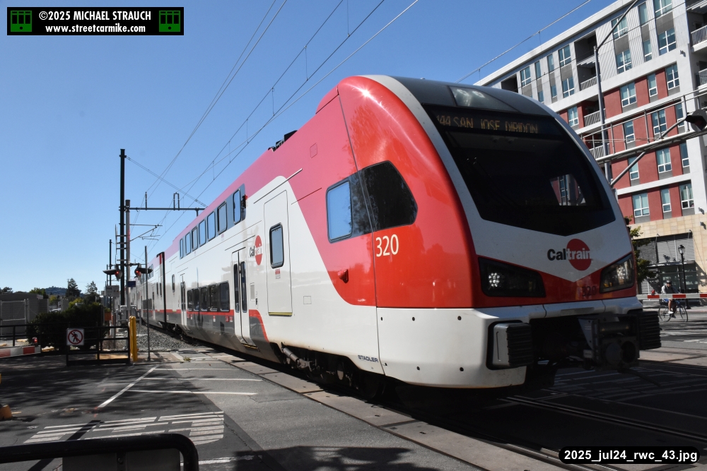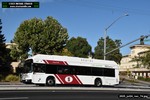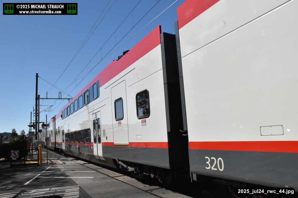 Gillig electric 5005 leaving on the 296 to East Palo Alto. Two Caltrain consists are included.