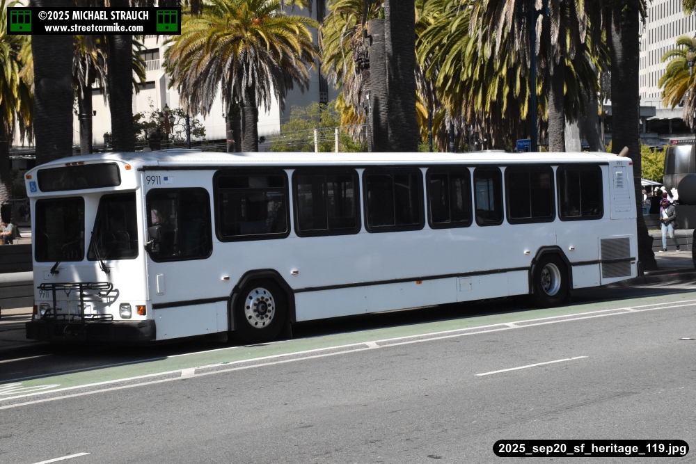 Also seen parked on Embarcadero were privately owned Muni 3182, VTA 9911, and the Pacific Bus Museum's