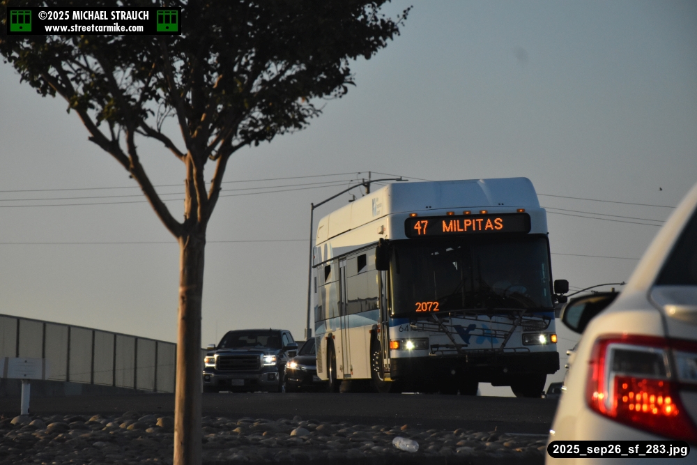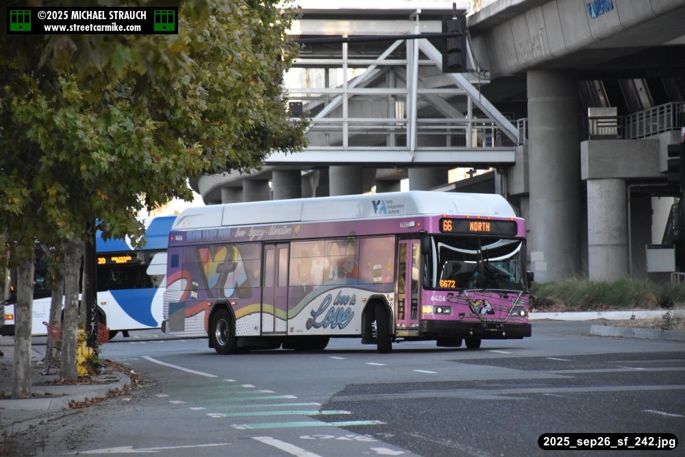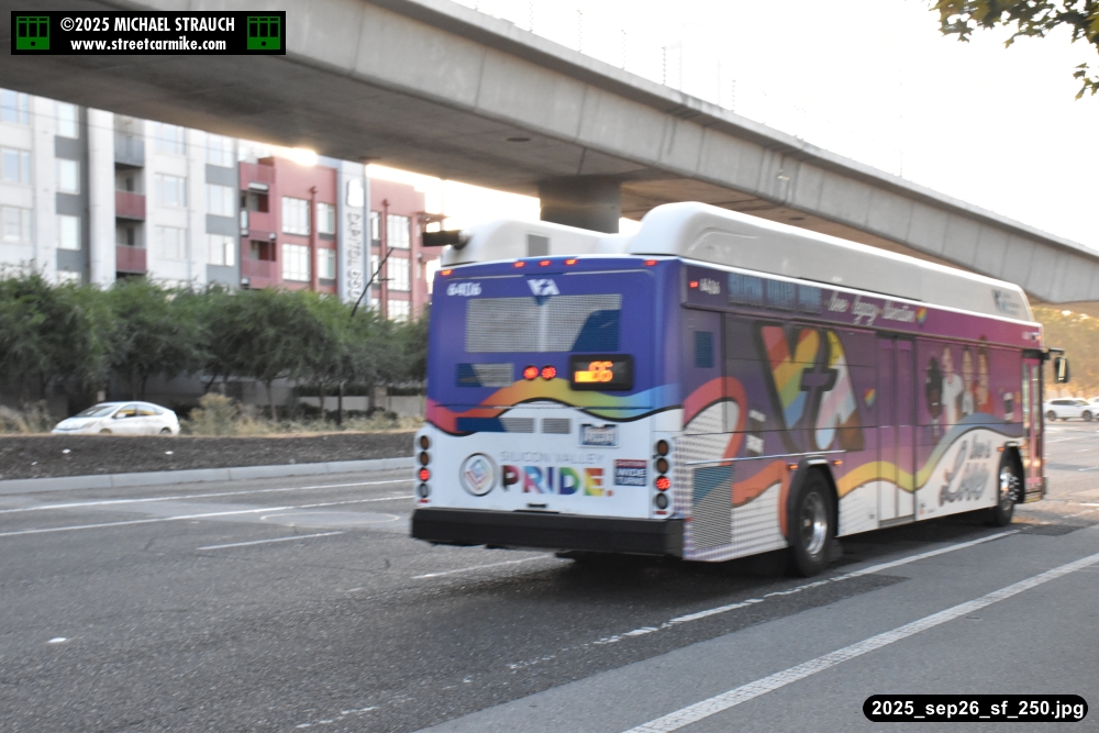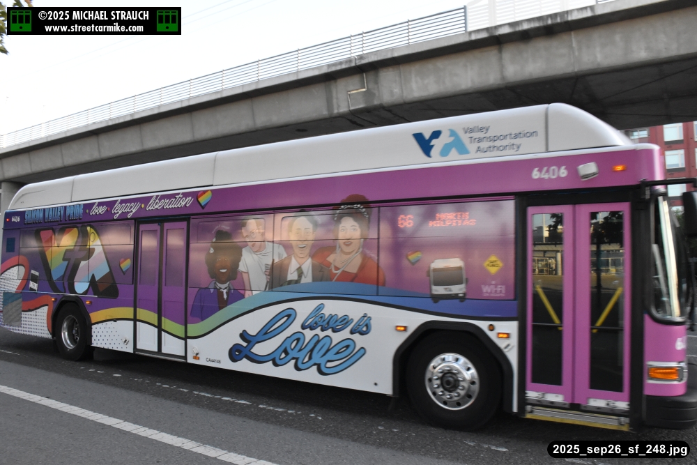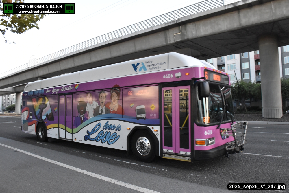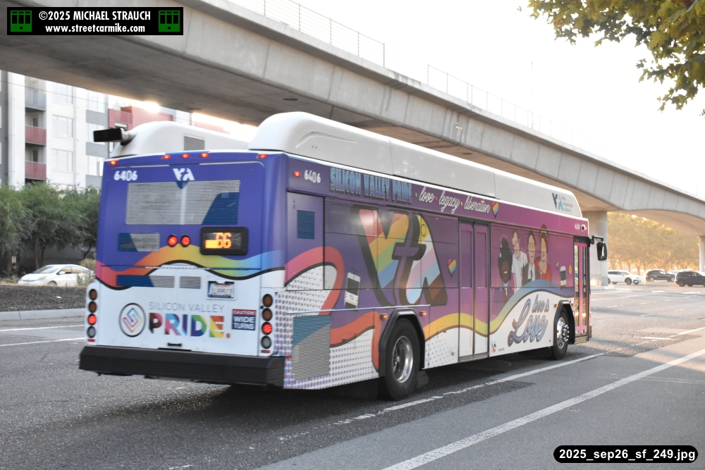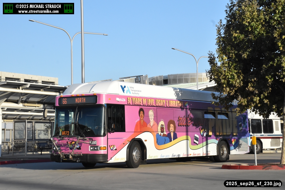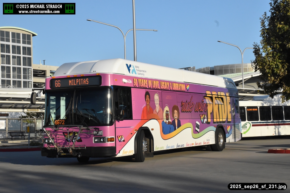 to my parked car at Milpitas Station. VTA Gillig 6406 in Pride livery was coming north on the 66,