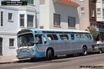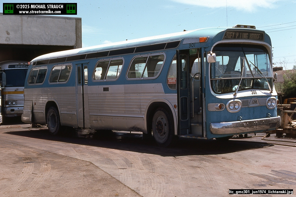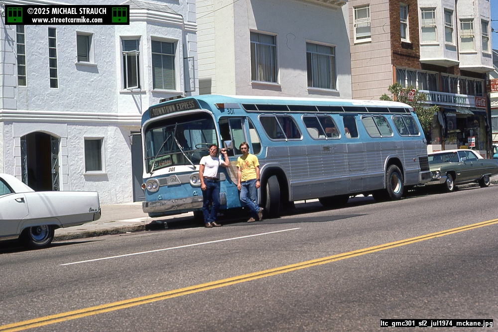 This is ex-Louisiana Transit Co. GM 301, which got sold to an operator in the San Francisco Bay Area. The first photo, credited to Frank Lichtanski, shows the coach at Eastshore Lines on Townsend St. in SF wearing the destination Huey Long Bridge (the short turn local for Jefferson Hwy. as the Kenner Express ran nonstop from S. Carrollton to there). The second and third photos, credited to John McKane, show the former Third and Balboa market (in 2025 is unlabeled but appears to vend flowers and plants) with 301 wearing a side destination sign roller cranked to 31 Balboa Limited in the front window and both gentlemen pictured in the second slide. Headsign reads Harahan in the first and Downtown Express in the second. All slides were processed in the summer of 1974. Three photos added 10/13/25.