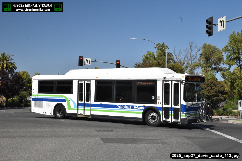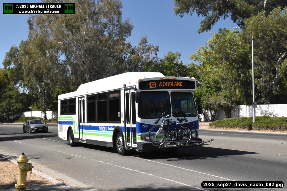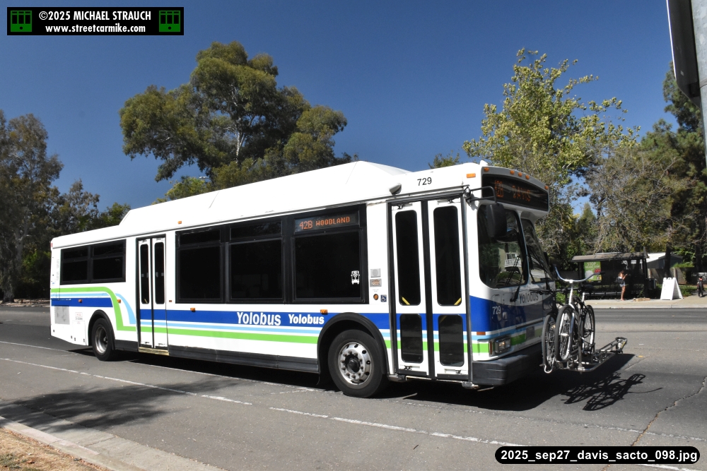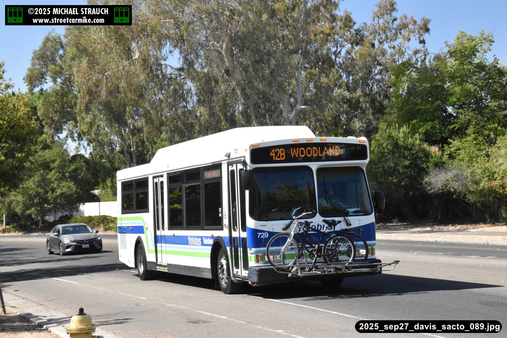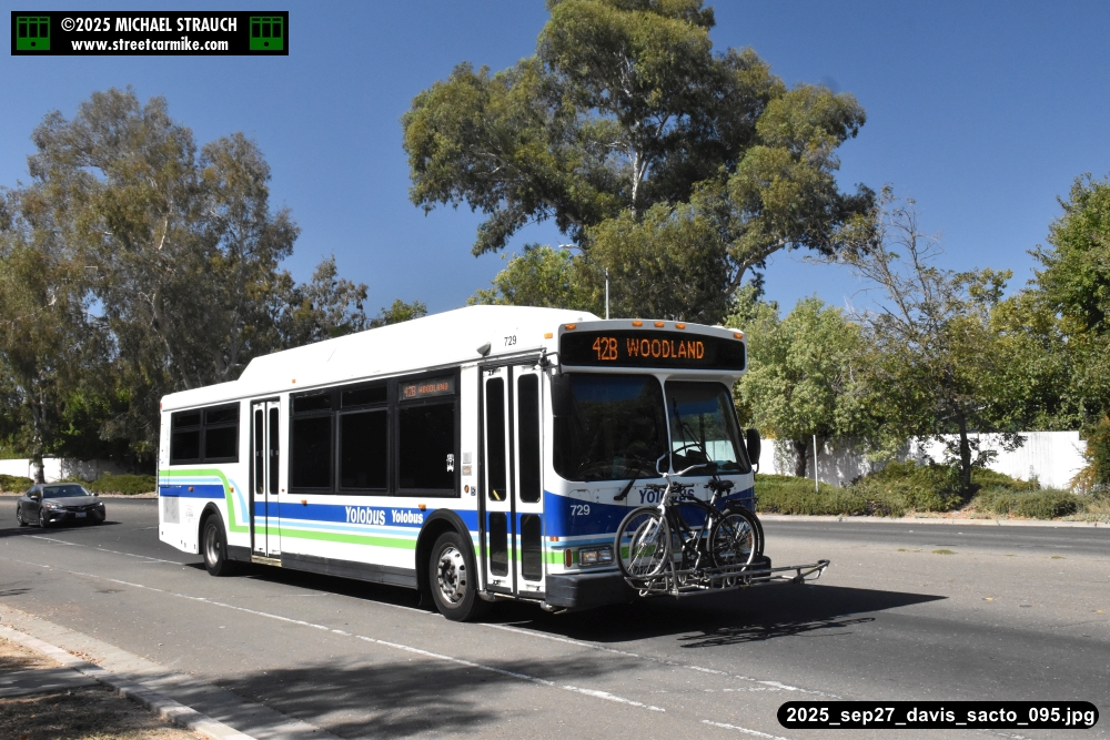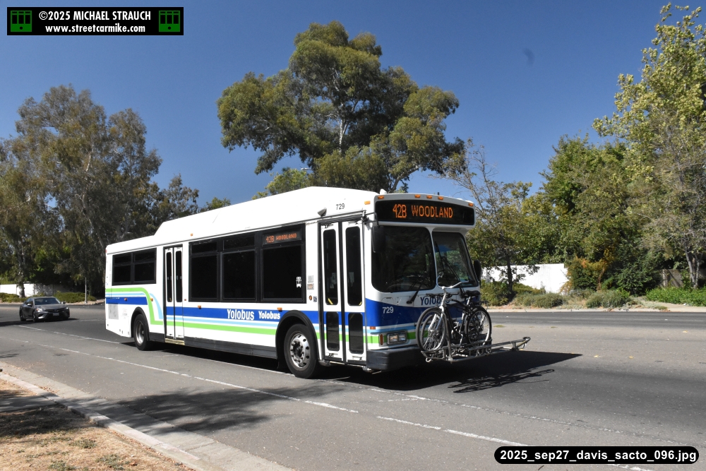 Orion 729, first of the series, still operating service on September 27, 2025. Here she is running the 42B counterclockwise loop on 5th St. in Davis. Fourteen photos added 10/13/25.
