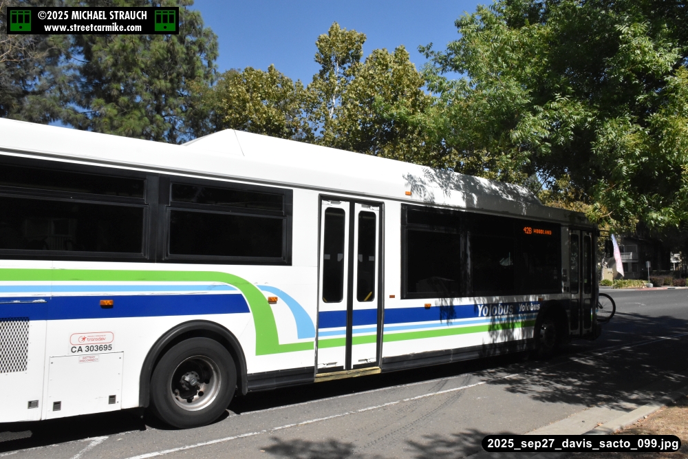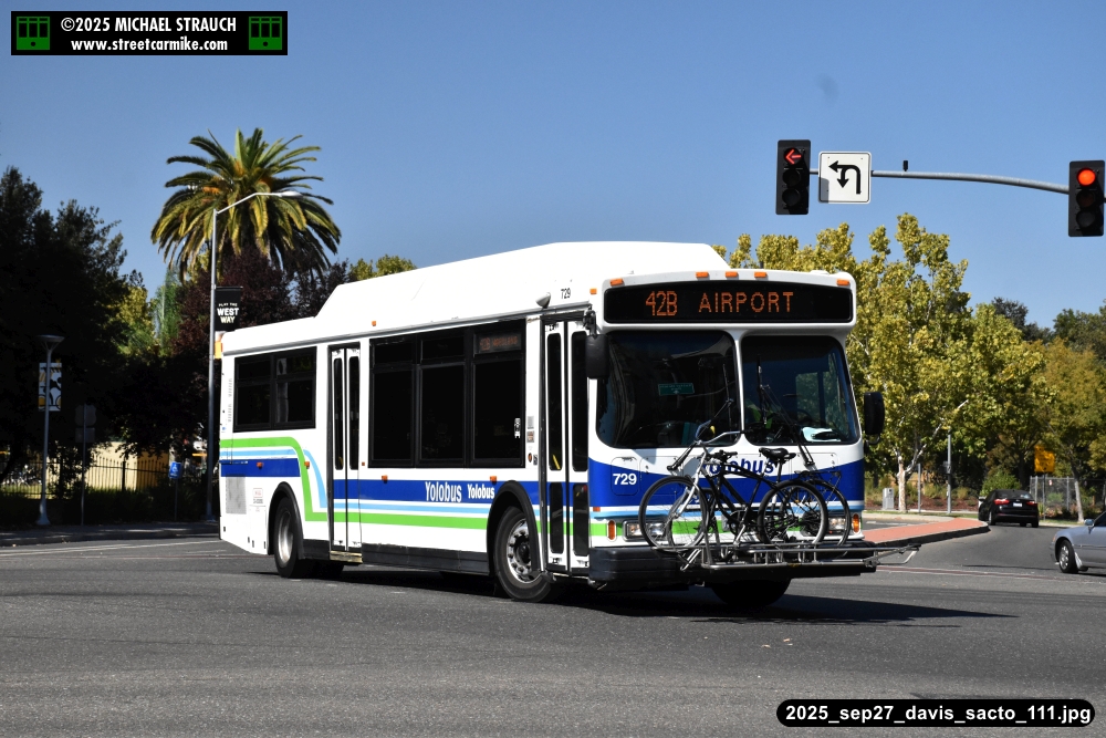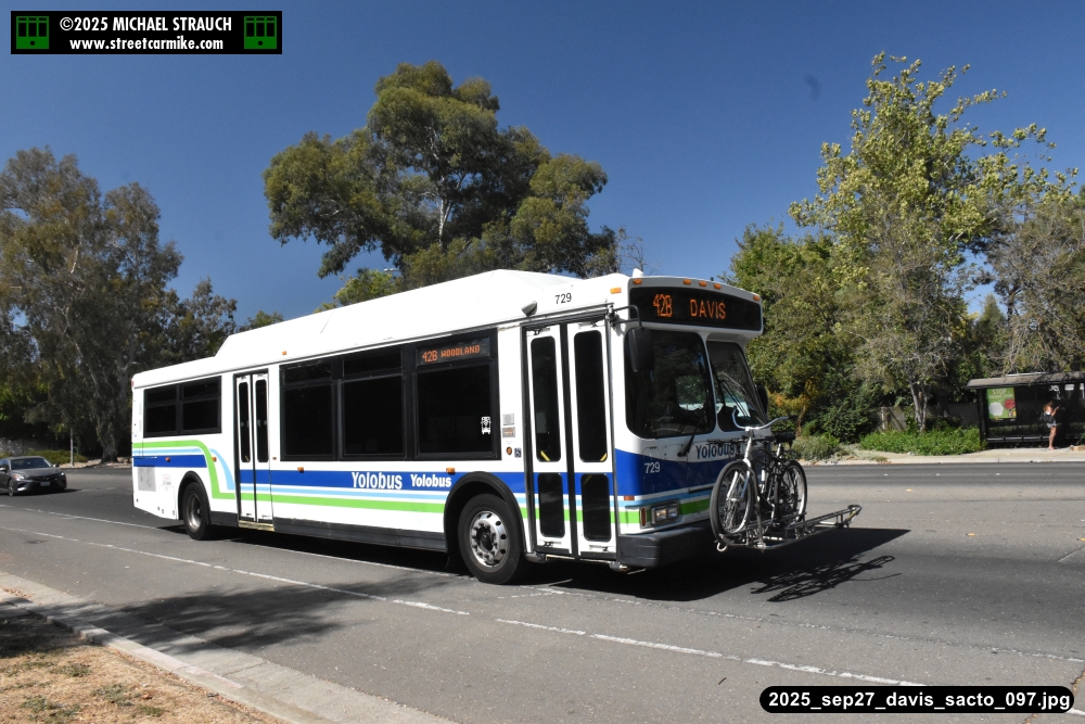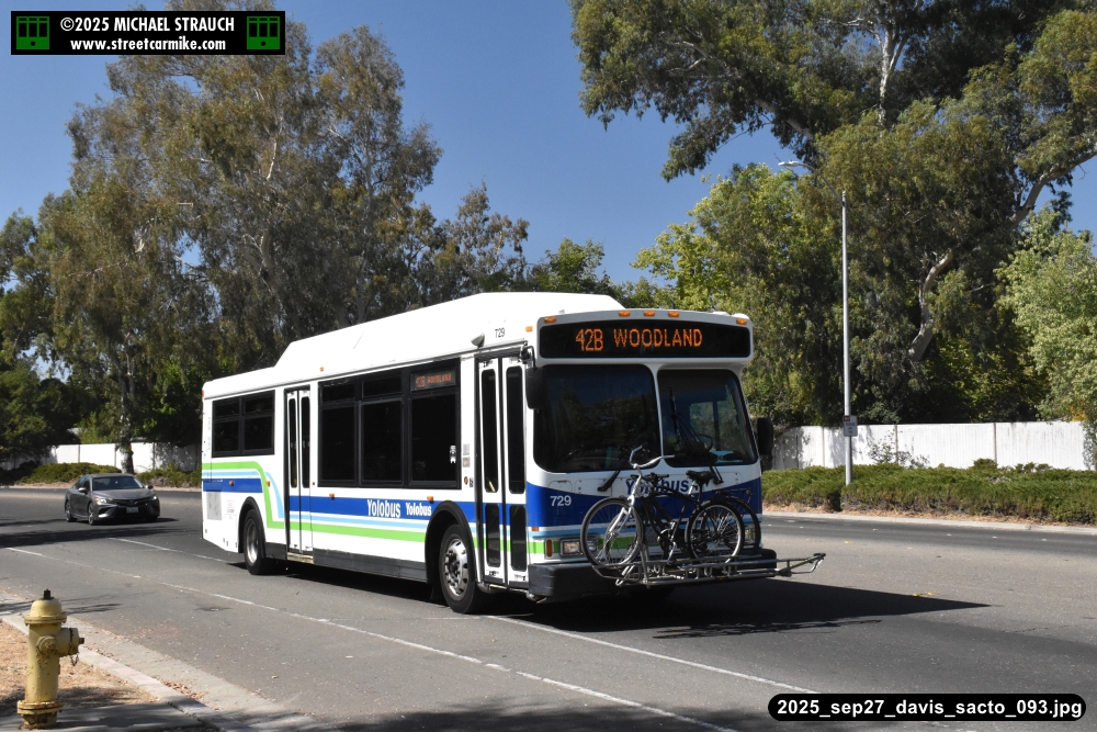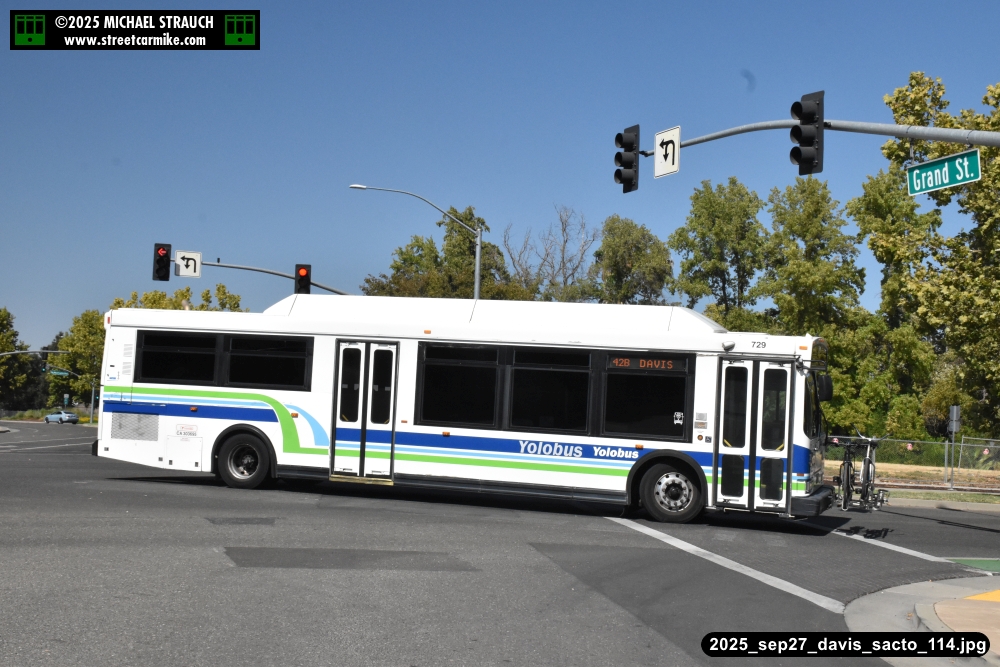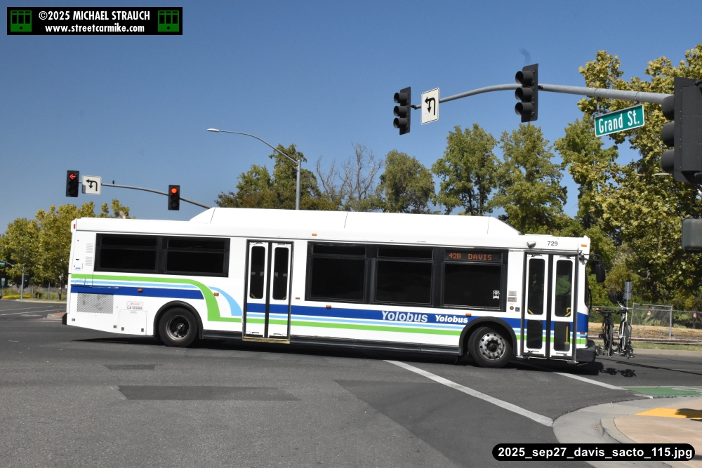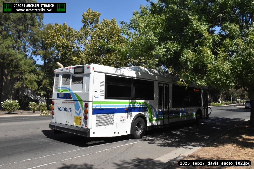 Orion 729, first of the series, still operating service on September 27, 2025. Here she is running the 42B counterclockwise loop on 5th St. in Davis. Fourteen photos added 10/13/25.